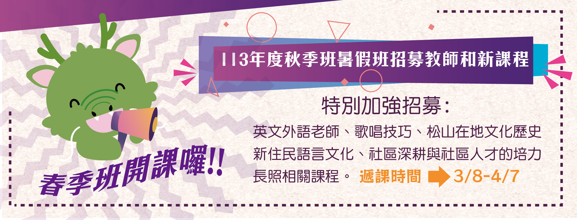 英文外語老師、歌唱技巧、松山在地文化歷史、新住民語言文化、社區深耕與社區人才的培力、長照相關課程。