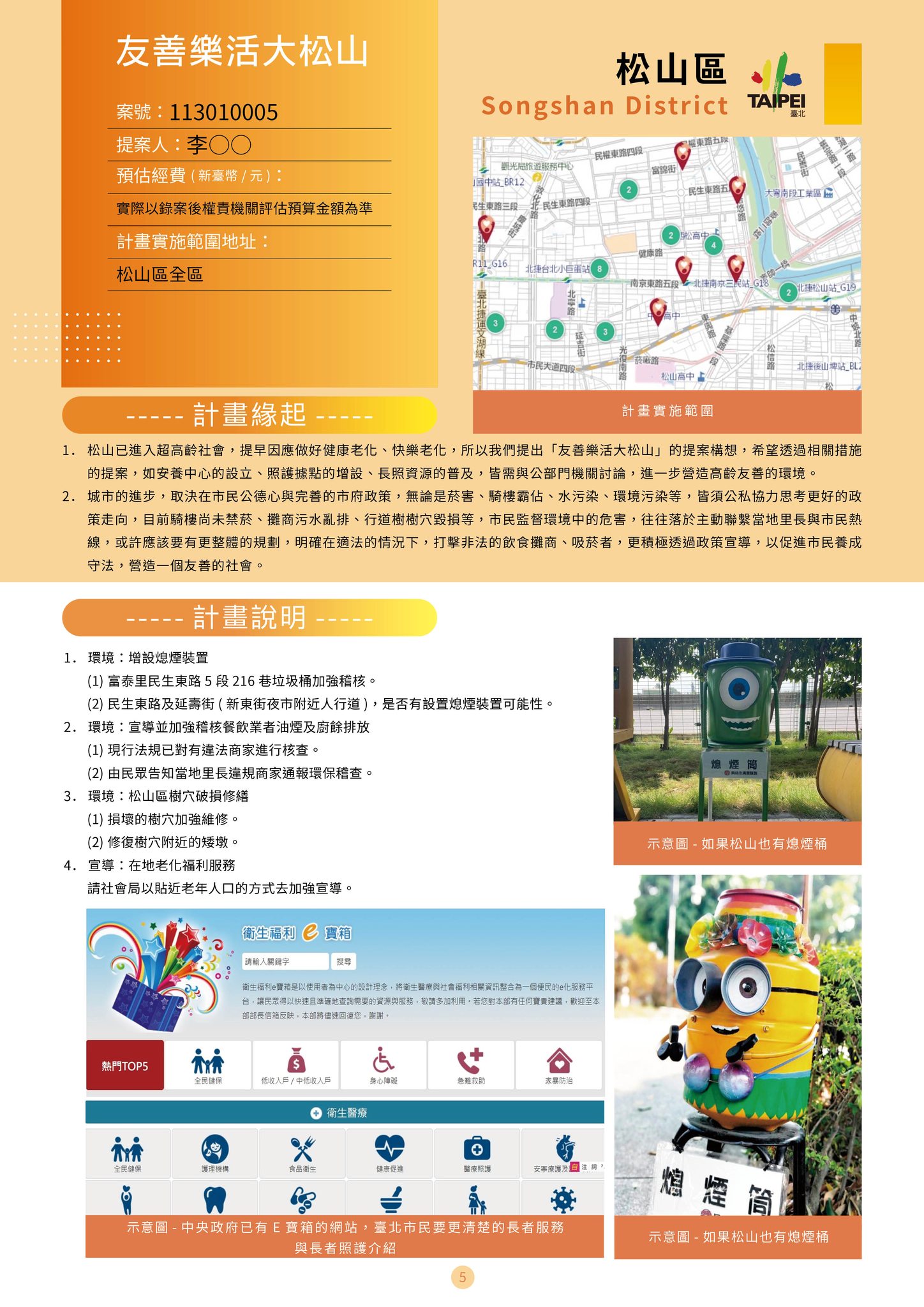 大家好,本年參與式提案由松山社大提出「友善樂活大松山」參與式預算案子,經住民大會、審議委員通過,現在進行IVOTING,通過後松山區將進行環境清潔維護、擁有獨特造型煙蒂桶、攤販油煙污水不再亂排放,歡迎大家踴躍報名參加投票。詳情連結